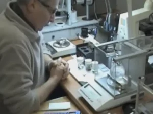 A practical demonstration of how specific gravity measurements are used to distinguish a light blue topaz from aquamarine, employing density liquids and a hydrostatic balance.
